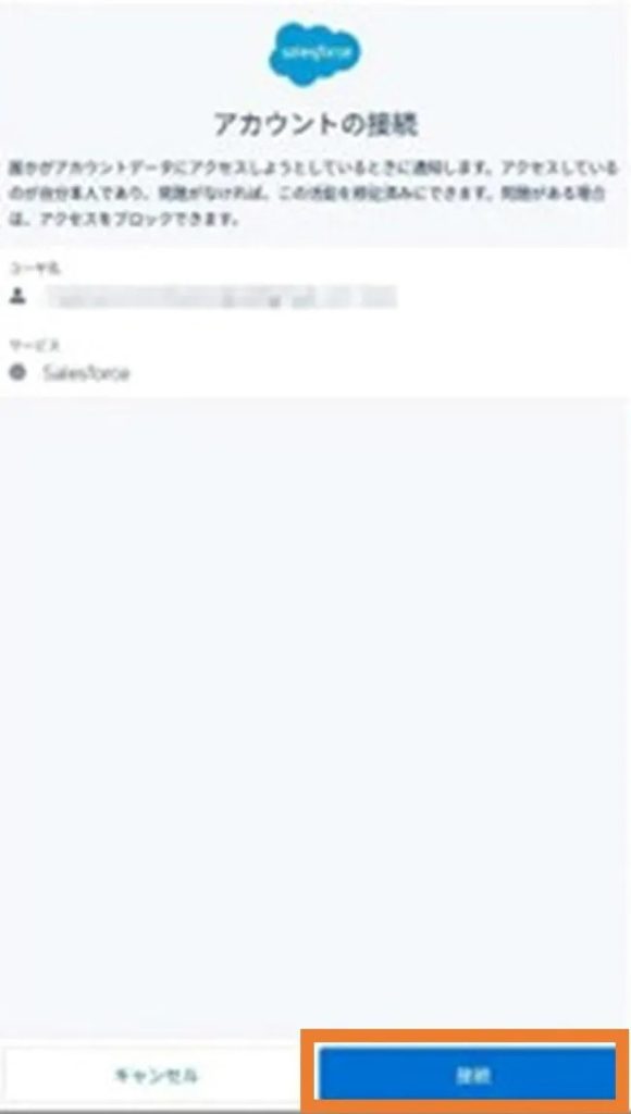 Salesforce Authenticatorアプリに以下の接続要求のメッセージが表示されるので、アカウントの接続画面でユーザ名とサービスを確認、間違いがなければ「接続」をクリックします。