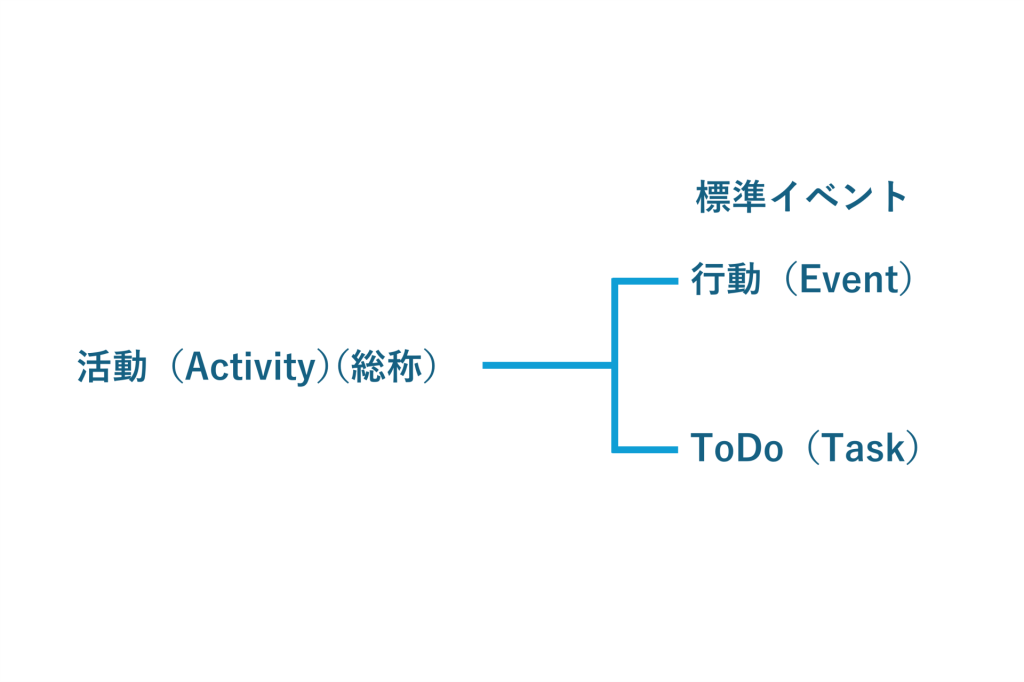 営業活動や顧客対応が効率的に業務を行うために有効なオブジェクトで、活動オブジェクトには、営業活動のデータが蓄積されていきます。「活動」「行動」「ToDo」を簡単な図で示すと、以下のような関係になります。