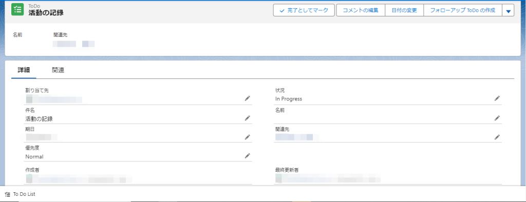 たとえば、予定にはなかった突発的な顧客対応が発生した場合「△△社に電話連絡した」のように、具体的な活動の内容を「活動の記録」へ登録するようにしましょう。「活動の記録」のデータは、ToDoオブジェクトのレコードとして登録されます。