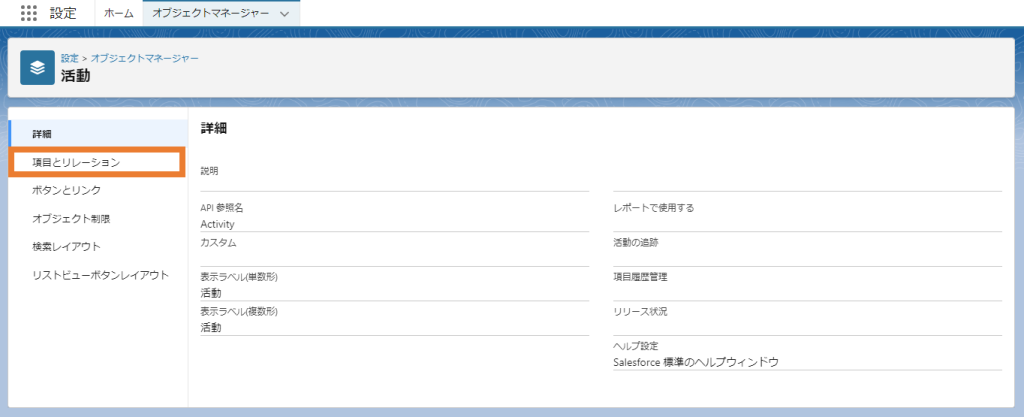 (3)「活動」オブジェクトページ左側の「項目とリレーション」をクリックし、次に「新規」をクリックしましょう。