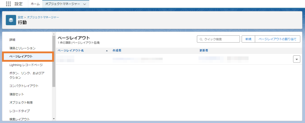 (3)「行動」または「ToDo」オブジェクトページ左側の「ページレイアウト」をクリックし、レイアウト変更したい「ページレイアウト名」をクリックします。