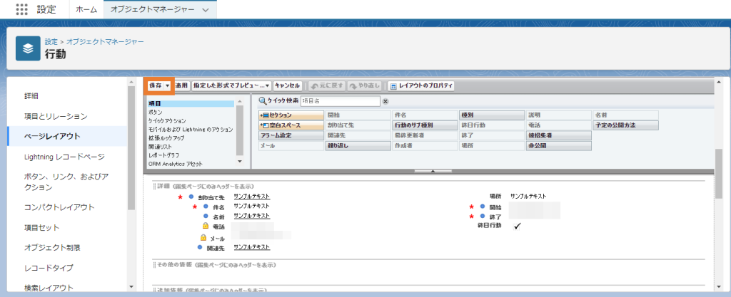 (4)表示させたい項目やボタンをドラッグ&ドロップで配置し、終了したら「保存」をクリックします。