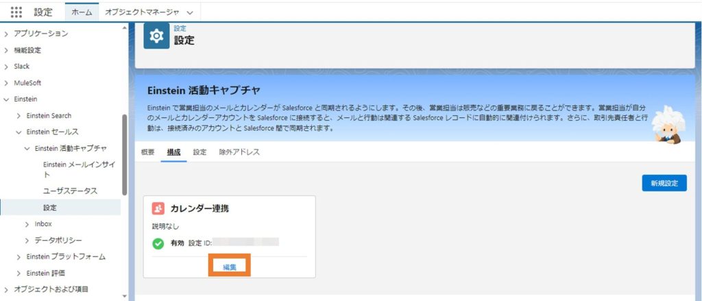 次に「設定」画面で「活動」と検索して「Einstein > 設定」を選択し、「構成」タブをクリック。