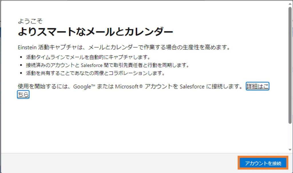 「メールとカレンダーをSalesforceに接続」の画面が表示されるので「Googleアカウントを接続」からサインインをして、Salesforceからのアクセスを許可します。