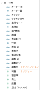 一般的に分析を行うためには「A別のB数」という形でデータを整理することが必要です。Tableauではこの「A別」を「ディメンション」、「B数」を「メジャー」と呼びます。データソースとしてExcelファイルに接続したとき、Tableauは自動で1行目に並んでいるデータをディメンションとメジャーに振り分けます。この自動振り分けが正しくない場合は、個々の項目をクリックして手動で調整しましょう。